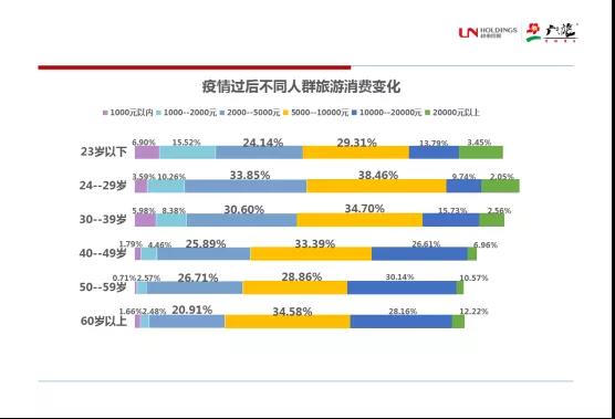 疫后人均(含多次)旅游消費金額方面,記者看到“2000-5000元”及“5000-10000元”兩檔的被選率最高,所有年齡人群此兩檔相加后的數據均超過了50%,基本體現了疫后旅游消費的主流趨勢。