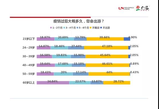 游客的看法又如何呢?從《報告》中受訪者的出游意愿來看,雖然目前國內疫情已逐漸向好,但此前積累的不安情緒依然影響著市民外出旅游的行動力,近4成受訪者出游計劃尚“不確定”,可值得留意的是,未來半年完全不出游的“宅家一族”僅占所有有效受訪者的3%不到,其余超過半數的受訪者都表達出“希望在疫情結束后的1至6個月內出游”的意愿;更有接近35%60歲以上的長者人群表達了疫情結束后1個月內即出游的強烈意愿,廣之旅方面預計此類人群也將成為旅游業復蘇初期的出游主力軍,而首波出游高峰則有可能會在再度官宣放假5天的“五一小黃金周”到來。